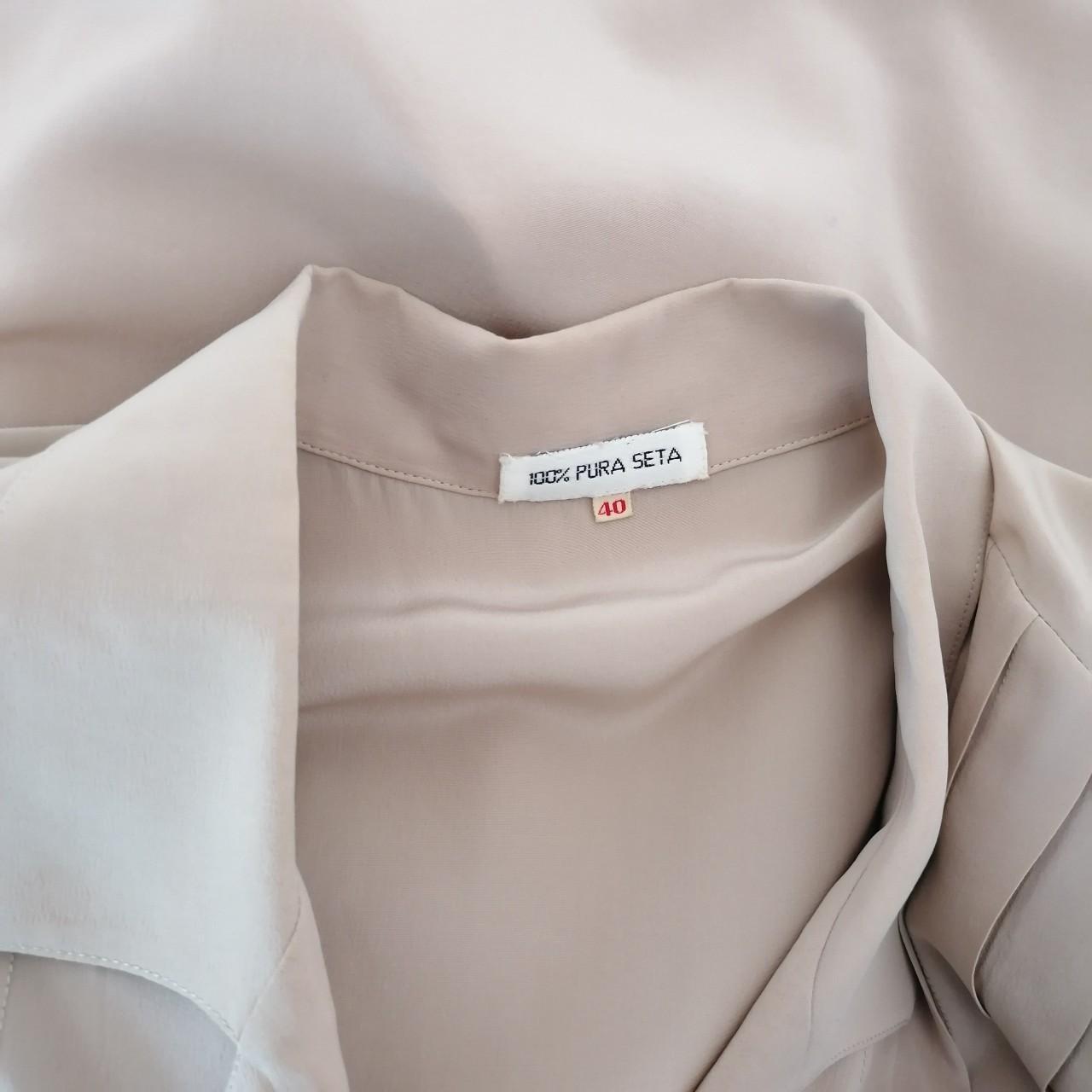 Una linea indiscutibilmente vintage per questa camicetta in pura seta anni ’90. Colore neutro, è resa particolarmente interessante dalla lavorazione a pieghe e arricchita da un taschino vero sul petto. Il collo è di tipo “convertibile”, il look generale molto femminile e delicato.