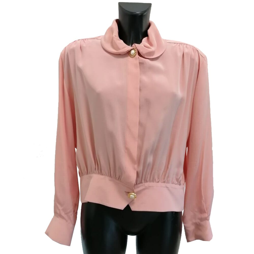 Pura seta camicia vintage rosa, spalle imbottite, due bottoni gioiello e bottoncini nascosti. Elegante e molto ricercata.