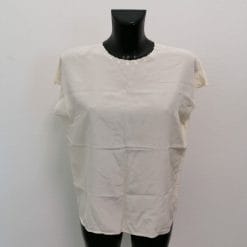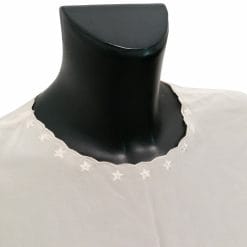 Seta, top vintage senza maniche con ricamo di stelline attorno al collo. Colore neutro. Bottoncino e apertura posteriormente sul collo. Vestibilità molto ampia, elegantissima, un capo vintage senza tempo.