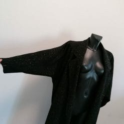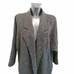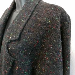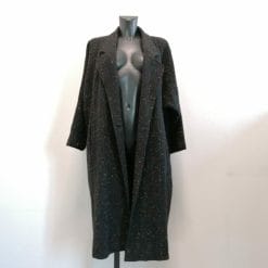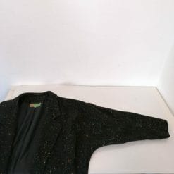Cappotto leggero vintage anni 80-90 fondo nero e fili colorati dalla bellissima linea, perfetto da portare anche aperto. Molto lungo, ha maniche tre quarti e un design che non si dimentica.