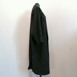 Soprabito, cappotto leggero oversize in lana anni 80 fondo nero con filo colorato, foderato. Sono presenti due asole, bottoni mancanti. Spalle raglan, manica a pipistrello.