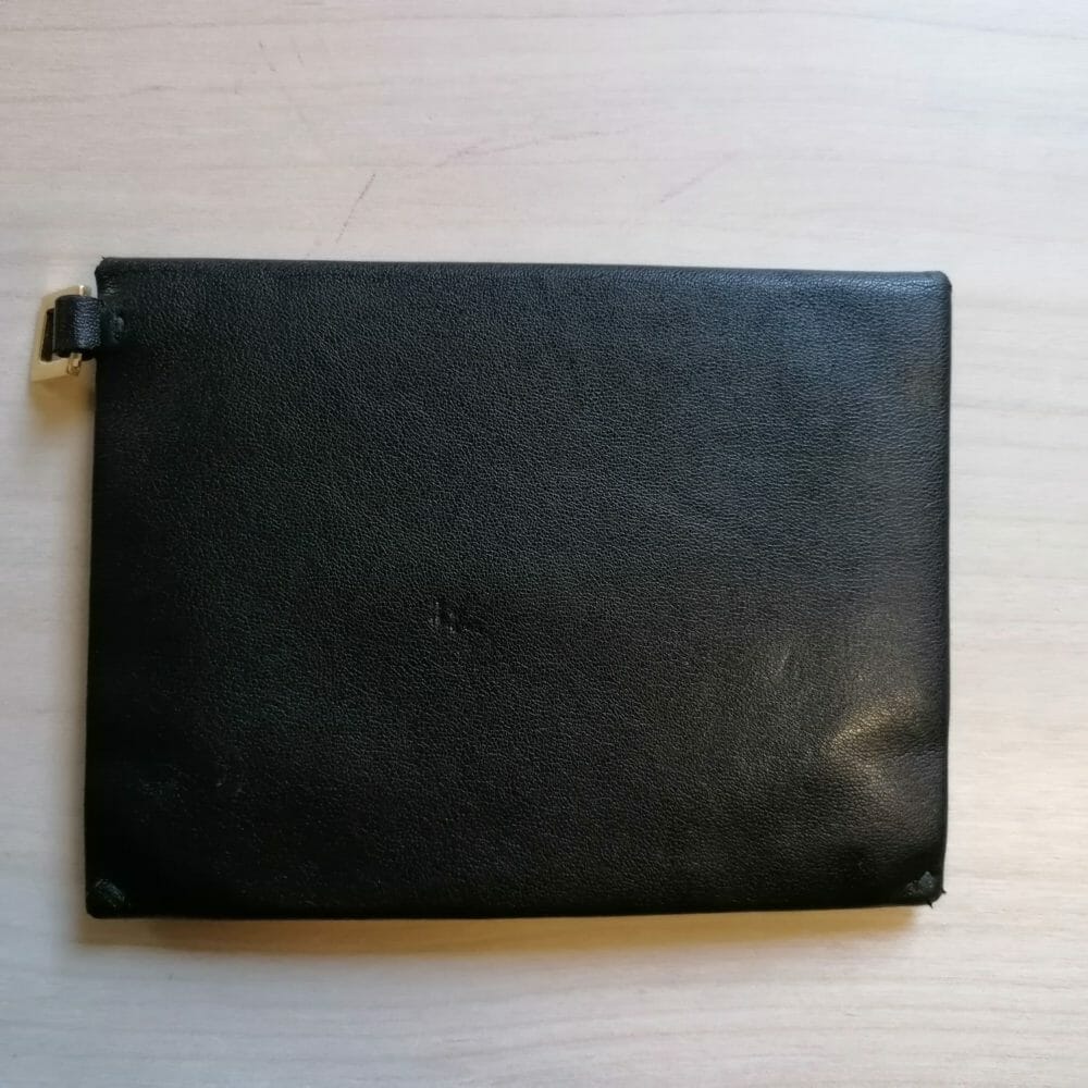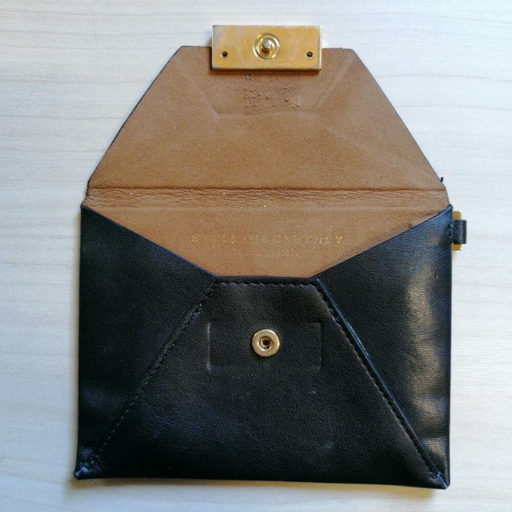 Stella McCartney black envelope, portamonete in vera pelle. C’è il gancio per attaccare un laccetto da polso.