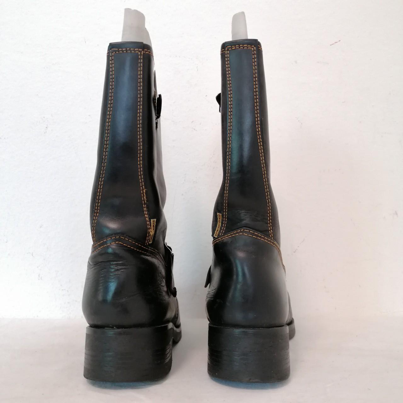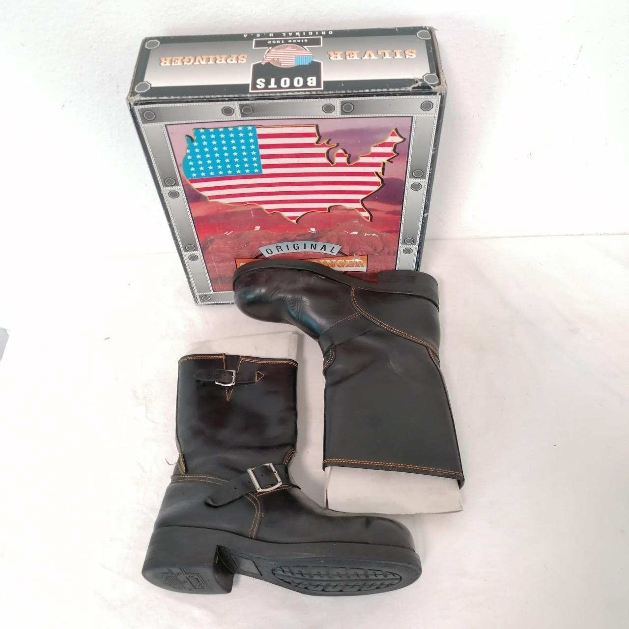 Stivali da motociclista del marchio vintage Silver Springer, ormai in trovabile. Un modello che richiama il classicissimo 883 o gli stivali Harley Davidson, calzature nate per essere resistenti e durevoli nell’iconico contesto dei biker.