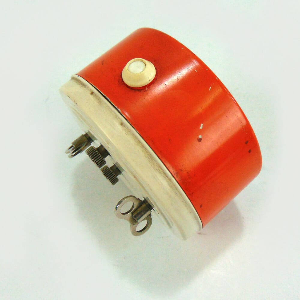 Sveglia anni ’70 Junghans, colore arancione con numeri in grassetto a carattere vintage. Un frizzante complemento d’arredo, marciante e suonante, pur con qualche leggera scrostatura, collezionata con il passare del tempo.