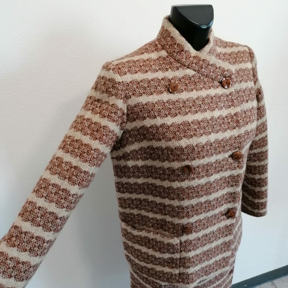 Giacca doppiopetto con taglio dritto e lunga gonna a portafoglio che si chiude con gancetti e lunga fila di bottoni laterali.