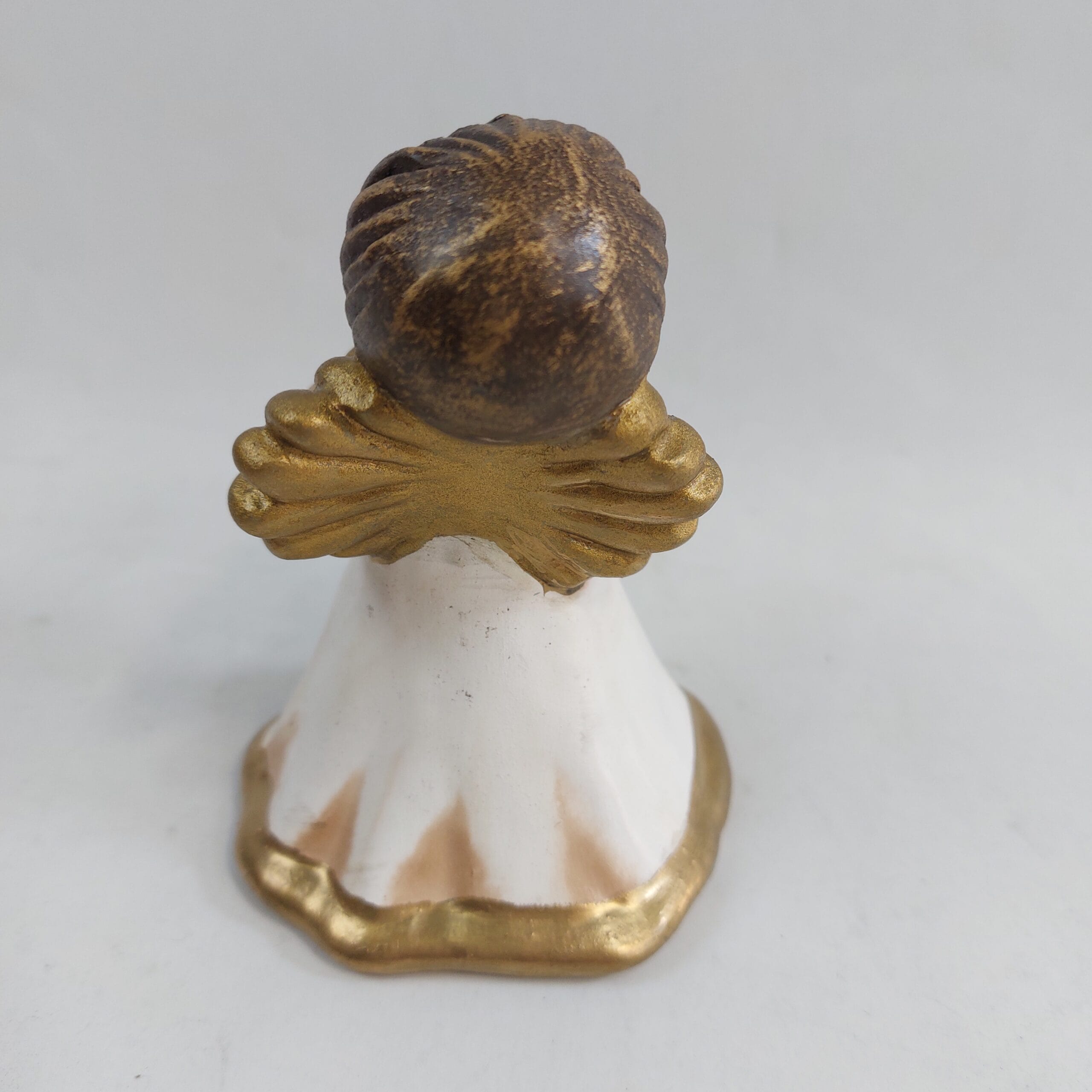 Piccola statuetta della Thun raffigurante un angelo che canta che tiene in mano dei fiori (probabilmente in origine era uno spazio per una candelina), vestito di bianco con dettagli dorati.