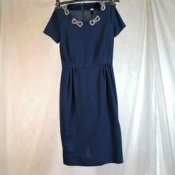 Miniabito in lana blu navy con applicazioni di paillettes alla scollatura. Spacchetto posteriore, maniche corte. Zip posteriore, foderato.