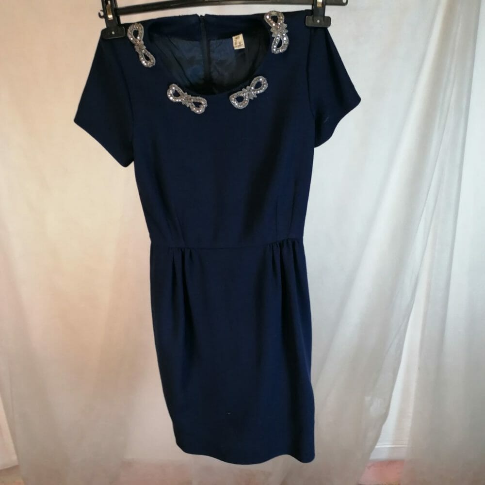 Miniabito in lana blu navy con applicazioni di paillettes alla scollatura. Spacchetto posteriore, maniche corte. Zip posteriore, foderato.