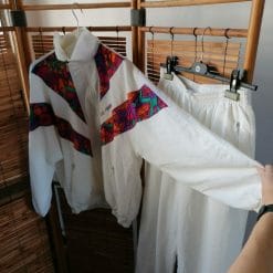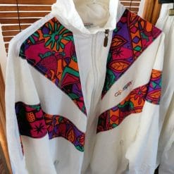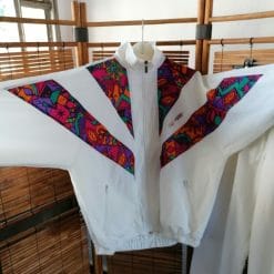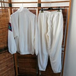 Attualissima tuta vintage che sembra fatta ieri, bianca con motivo frontale coloratissimo. Due tasche con zip sia sulla giacca che sui pantaloni. Esterno poliammide e interno 50% cotone 50 poliestere. Maniche a pipistrello. Marca Campagnolo Sport.