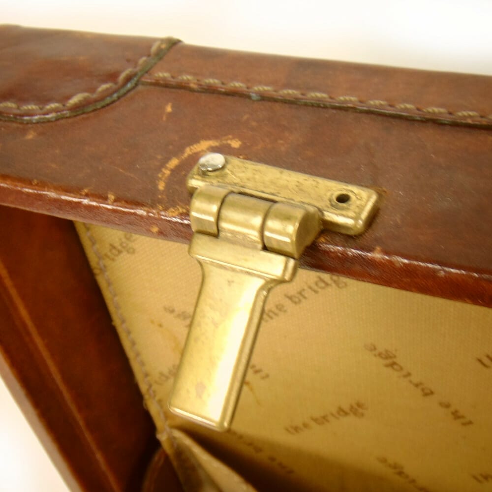 Valigetta ventiquattrore rigida The Bridge in spesso cuoio rossiccio , con angoli rinforzati ed apertura a scatto con combinazione. La valigia richiede qualche intervento di riparazione, dalla chiusura di sinistra (la molla non scatta e manca un chiodo di fissaggio) ai piedini d’appoggio sottostanti (presente uno su quattro), ma robustezza e prestigio sono rimasti intatti.