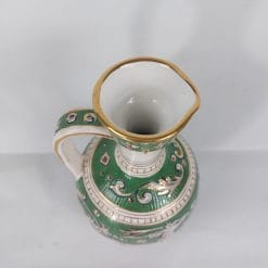 Splendido ed antico vaso o brocca in ceramica di Deruta con disegni e decorazioni di fiori e piante bianchi su sfondo verde. In ottimo stato e con numerazione nella parte inferiore.