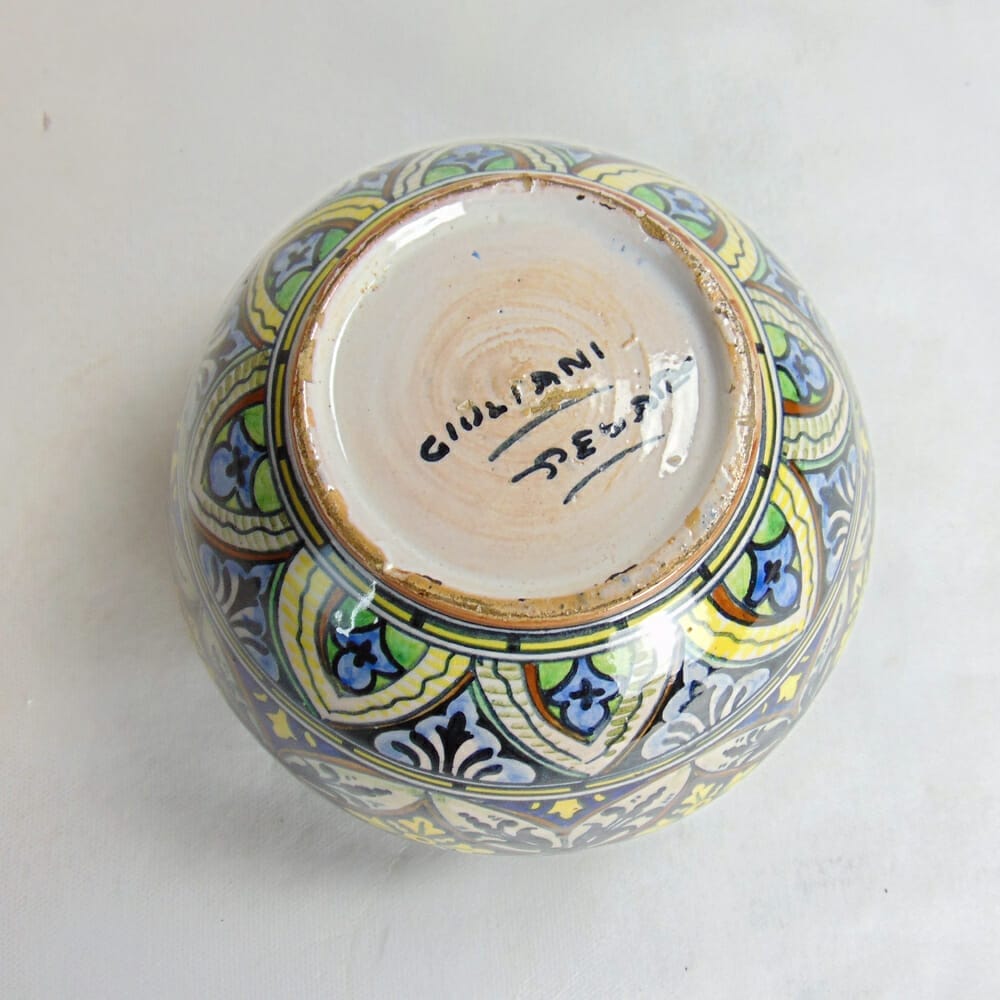 Piccolo vaso in maiolica firmato dalla celebre manifattura Giuliani, Pesaro. Raffinate decorazioni floreali come da tradizione della zona di produzione, è un classico adatto ad ogni stile di interno. In perfette condizioni, no sbeccature e colori vivi.