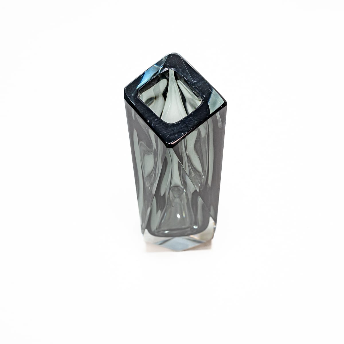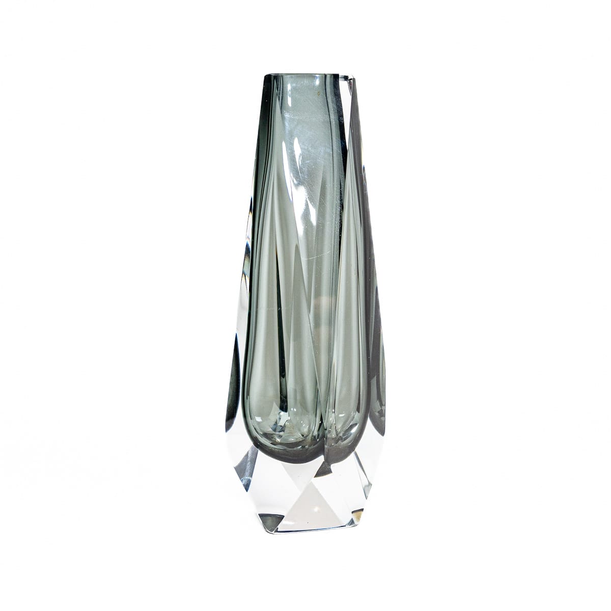 Elegante e raffinato, questo vaso in vetro di Murano sommerso Flavio Poli è un autentico pezzo da collezione, realizzato negli anni ’60 per Alessandro Mandruzzato. Caratterizzato da una forma geometrica sfaccettata e da un’affascinante tonalità grigio fumé, questo vaso incarna la maestria della lavorazione artistica del vetro veneziano.