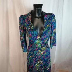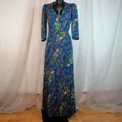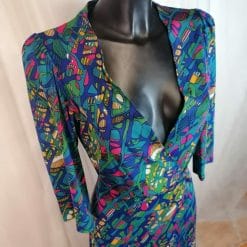 Per non sfigurare nemmeno tra le mura domestiche ed essere impeccabili anche durante il relax, proponiamo questa vestaglia sciantosissima anni 70. La linea valorizza le curve e si adatta bene al corpo grazie alla cintura, la fantasia colorata sdrammatizza il taglio un po’ da diva.
