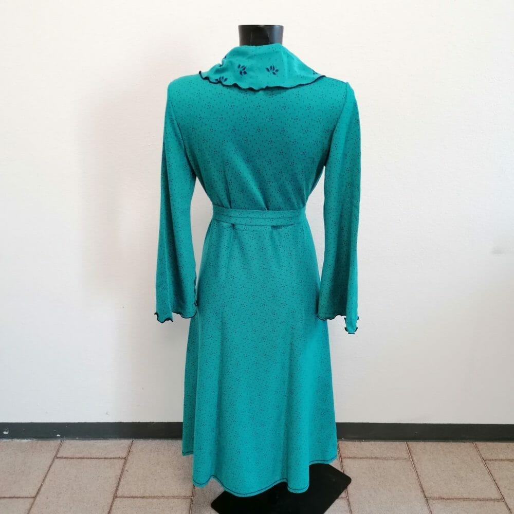 Vestaglia vintage, molto femminile ed elegante. Chiusura a portafogli con laccio interno e bottoncino, cintura. In poliacrilico effetti misto lana.