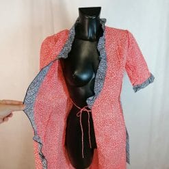 Originale e allegra questa vestaglia da camera adatta anche semplicemente come abito per stare in casa durante il giorno. Maniche al gomito e volant a contrasto completano e complementano un capo semplice ma d’effetto.