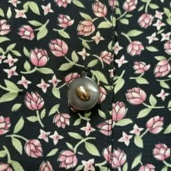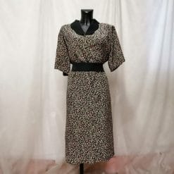 Vestito a camicione dritto in tessuto morbido, probabilmente raion. Motivo di fiori su fondo nero, allacciatura parziale, vestibilità ottima anche con una cintura.