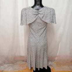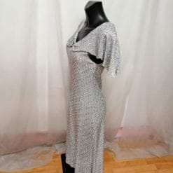 Vestito argentato con bellissima linea adatta ad ogni fisico. Composizione 89% viscosa 11% lurex, elastico. Si tratta di un bell’abito scivolato senza maniche, più lungo dietro, con sovrapposta una mantellina fissata da palline trasparenti sfaccettate.