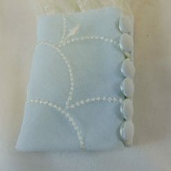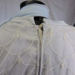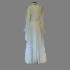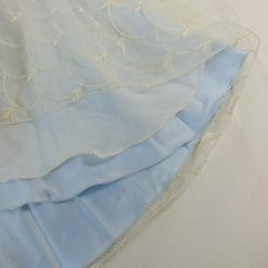 Splendido abito celeste di fattura sartoriale da cerimonia. Autentico vintage degli anni ’70. Le maniche bianche in pizzo donano leggerezza al vestito, e i numerosi strati di sottogonne arricchiscono la parte inferiore. L’indumento è corredato da un foulard abbinato. Presenta qualche segno del tempo come da fotografia.