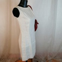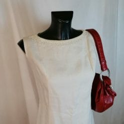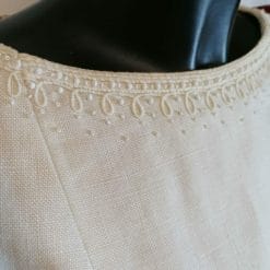 Vestito in lino smanicato sartoriale con decorazione e perline alla scollatura. Lunga zip posteriore, materiale ben sostenuto, bel taglio sfiancato anni 60. Colore panna.