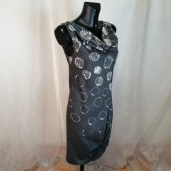 Vestito Max Mara antracite in cotone 97% elastam 3%, con disegno di cerchi bianchi. La parte posteriore è tinta unita. Zip laterale per una vestibilità perfetta, scollo drappeggiato.