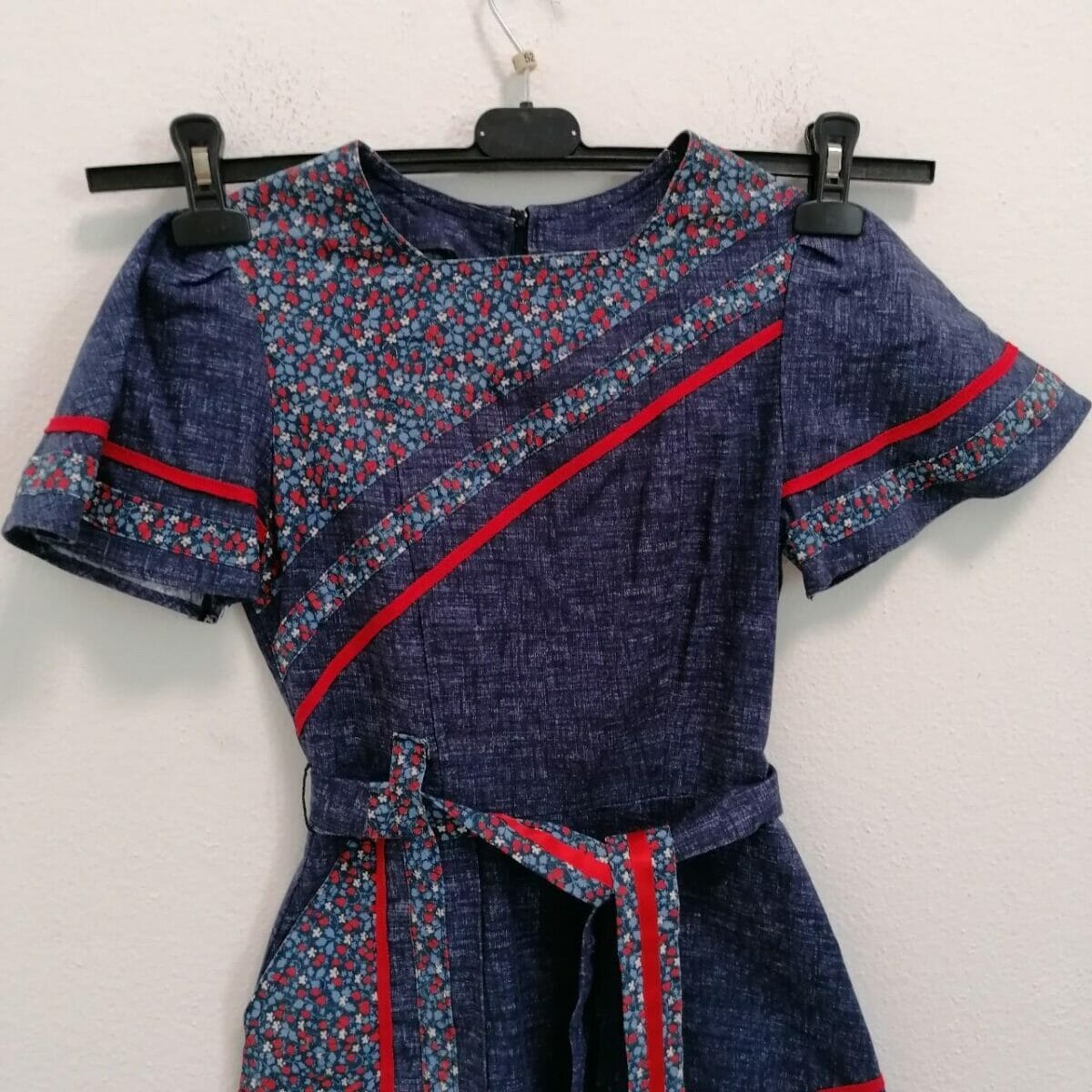 Questo affascinante abito vintage, frutto di maestria artigianale, cattura lo sguardo con la sua fusione di stile e dettagli unici. Cucito a mano con cura e dedizione, il tessuto di denim leggero diventa un telaio perfetto per gli inserti in tessuto e la delicata passamaneria, che aggiungono profondità e texture al capo.