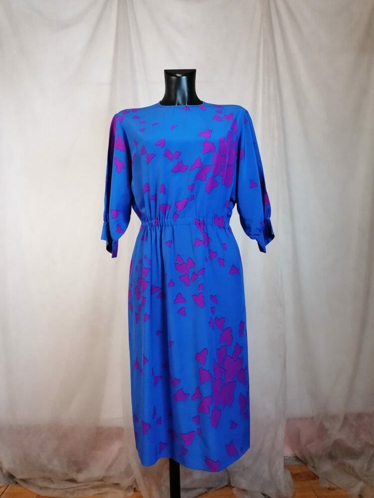 Realizzato a mano, questo abito è caratterizzato dalla scelta di colori forti, due diverse tonalità di viola una tendente al rosa e una al blu, per un bel pattern originale di farfalle in volo. Manca purtroppo l’etichetta con l’esatta composizione del tessuto